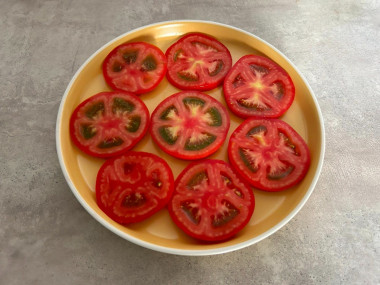 Возьмите помидоры, хорошо помойте в проточной воде, обсушите, удалите плодоножки. Нарежьте кружками толщиной около 5 мм.