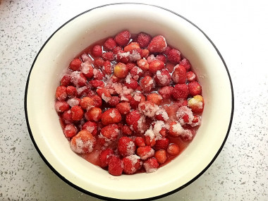 Клубнику мою так же. Очень удобно, весь песок оседает на дно чаши. Главное быстро вынуть ягоды, чтобы они не успели напитаться водой. У меня был 1 кг. клубники в чистом виде, поэтому сахара взяла столько же. Иногда добавляю меньше, но тогда ягоды выглядят не очень яркими.