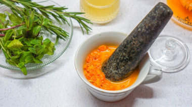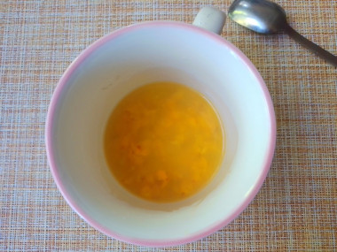 Достала замороженные ягоды облепихи, которые собирала осенью на даче, выложила их в кружку и добавила немного горячей воды, чтобы ягоды было легче размять. Пестиком измельчила ягоды облепихи в пюреобразную смесь.