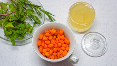 На дно заварочного чайника добавила несколько веточек свежей ароматной мяты, ягодную смесь переложила в чайное ситечко. К ягодной смеси добавила несколько ложечек майского мёда и залила горячей водой. Оставила на несколько минут для того, чтобы облепиховый напиток настоялся и раскрыл свой вкус.