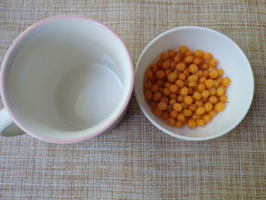 Ягоды облепихи выложите в небольшую кружку, залейте горячей водой, немного их промойте и всю воду сразу же слейте.
