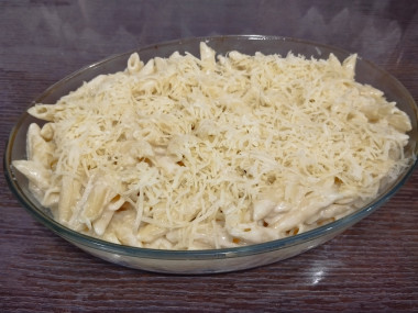 Сыр я добавляла одного вида,который натерла на мелкой тёрке. Большую половина добавила в соус,а оставшийся сыр посыпала сверху на макароны.
