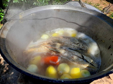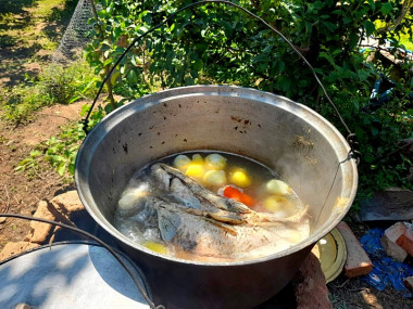 Решили сварить уху на костре в казане по этому рецепту. Заинтересовал порядок закладки продуктов. Интересно, что рыба добавляется в уже готовый бульон. Обычно для ухи мы используем мелкую рыбу разного вида. Но в этот раз в наличии были только два сазанчика, варили из них. Мы тоже начистили для ухи несколько мелких луковичек, так вкуснее получается. Картошку нарезали крупно, а морковь положили целую. После добавления в котел рыбы проварили 15 минут, т. к. сазан рыба крупная, ей нужно больше времени на приготовление. Зелень в супе у нас не все любят, поэтому добавляли в тарелку тем, кому хотелось. Полено не окунали, а вот рюмку водки в уху влили) В силу обстоятельств не смогла сделать фото в тарелочке. А уха получилась великолепная, вкусная, наваристая! Мне кажется не обязательно уголёк тушить в котле, и без этого уха получилась с дымком. На природе вся еда аппетитнее становится)