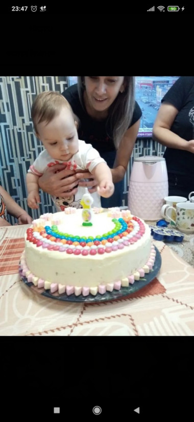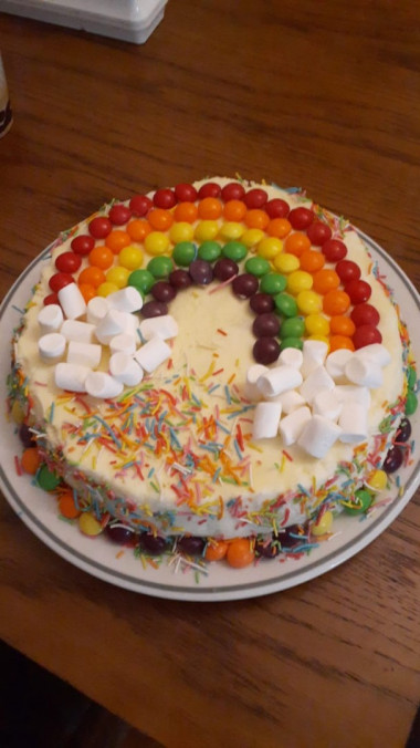Здравствуйте! Спасибо большое Вам за интересный рецепт Торт Радуга! Так как мой малыш пока не ест ягоды и творог, я взяла за основу торта цветные коржи (использовала 7 пищевых красителей) и заварной крем, а вот Ваше украшение торта меня очень впечатлило. Старалась повторить ваше украшение, но получилось немного не так, как у вас. По своим причинам готовила заварной крем для торта. Верх украсила кругом из мастики, а бока белковой глазурью. Радугу выложила цветным драже, смотря на ваше фото. Облака сделала из маршмэллоу, старалась как у вас) Вместо кондитерской посыпки положила шарики из остатков мастики.