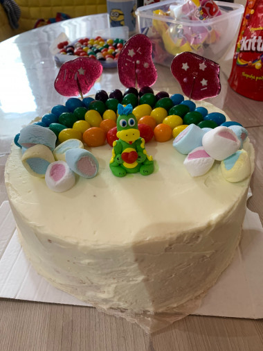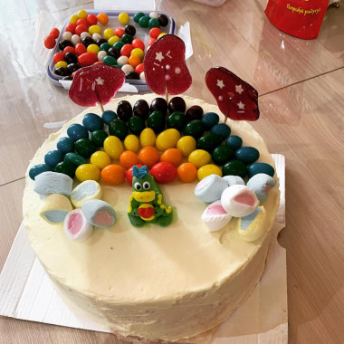 Единственное, что фруктовое драже на второй день отдает часть своего красителя крему и становится твёрдым из-за температуры в холодильнике. Но ради такой красоты можно и потерпеть :)