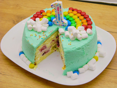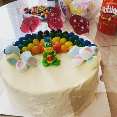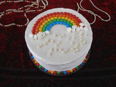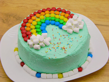 Покройте этим кремом верх и бока торта. Перед самой подачей украсьте торт. Из фруктового драже выложите радугу и юбочку по кругу торта, а из мини-маршмеллоу облачка. Кондитерскую посыпку (лучше белого цвета) распределите снизу. Торт готов!