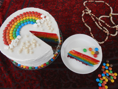 Отзыв 2: Просто замечательное и нетривиальное оформление торта! Здесь нашлось место и самой радуге, и облачкам из маршмелоу. Такому лакомству будут рады не только дети, но и взрослые.