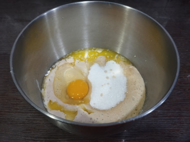 Вылейте в получившуюся лунку опару и растопленное масло, разбейте яйцо и всыпьте оставшийся сахар. Если вам нужно нейтральное тесто, то достаточно 1 ст. л. сахара. Так как я готовила из теста фруктовый пирог и мне нужно было выраженное сладкое тесто, то сахара положила еще около 90 гр.