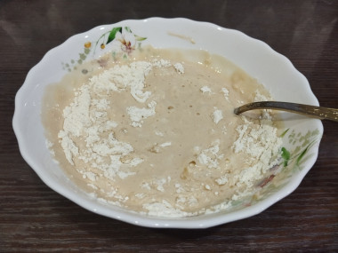 В теплую ряженку добавьте 2 ст. л. муки, 1 ст. л. сахара, соль и сухие дрожжи. !!! Сухие дрожжи иногда трудно размешать, так как они образуют комочки. Лучше рассыпать их по поверхности жидкости тонким слоем. Но перед этим размешать в ряженке муку, соль и сахар.