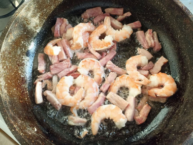 Затем добавьте креветки и еще раз обжарьте все вместе около 5-7 минут.