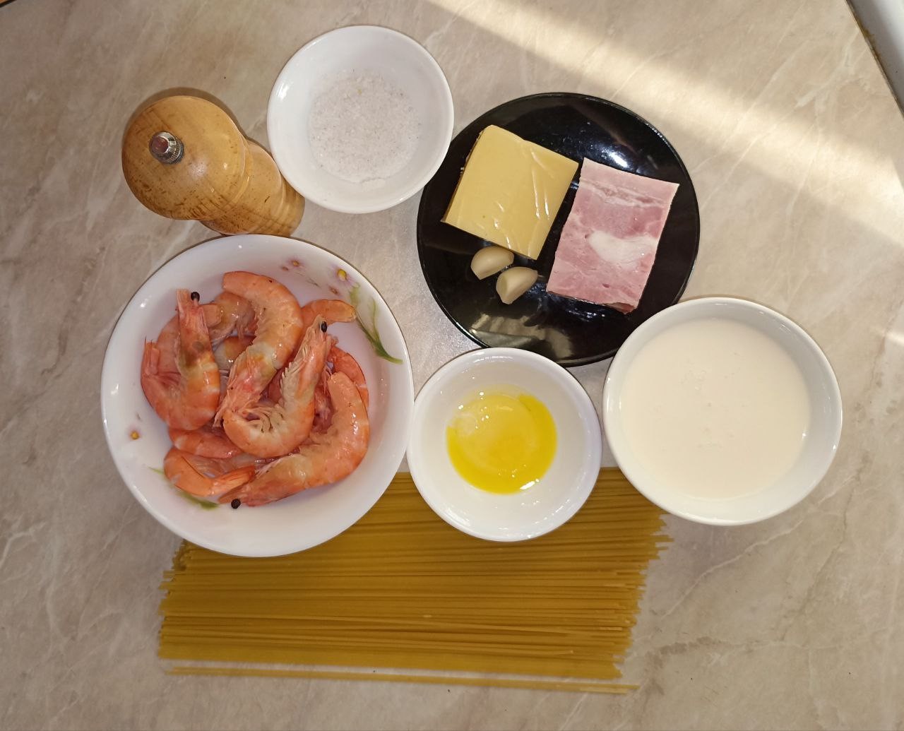 Подготовьте все необходимые продукты. Пасту берите любую по своему вкусу. Креветки крупные, королевские, мелкие салатные креветки не подойдут. Сливки средней степени жирности, - обычно 20%. Бекон подойдет любой: и сырой, и сырокопченый, и варенокопченый, но имейте в виду, что копченый бекон придаст свой привкус готовому блюду. Вместо пармезана можно взять любой твёрдый сыр.