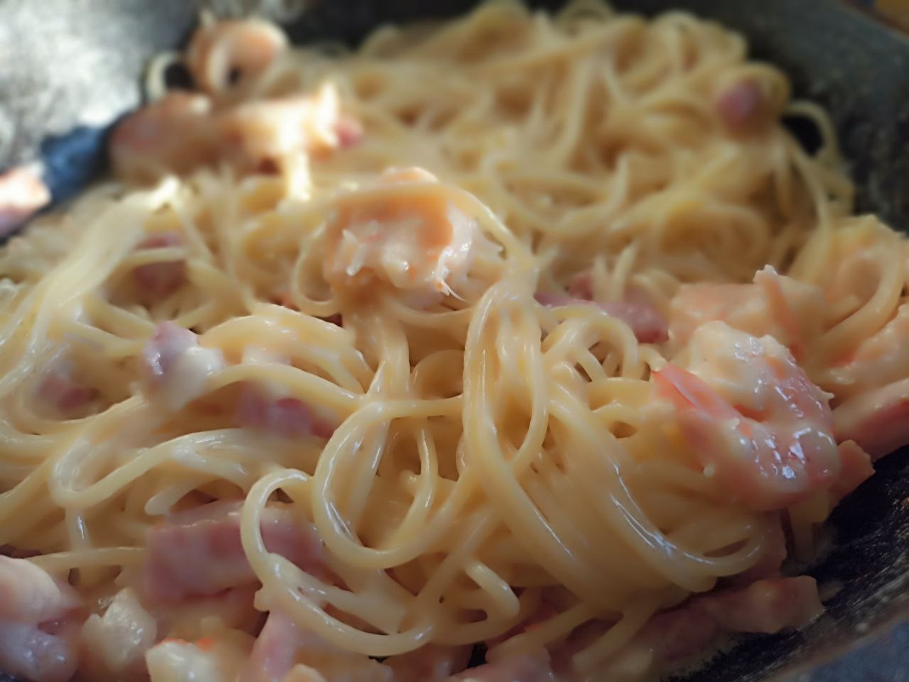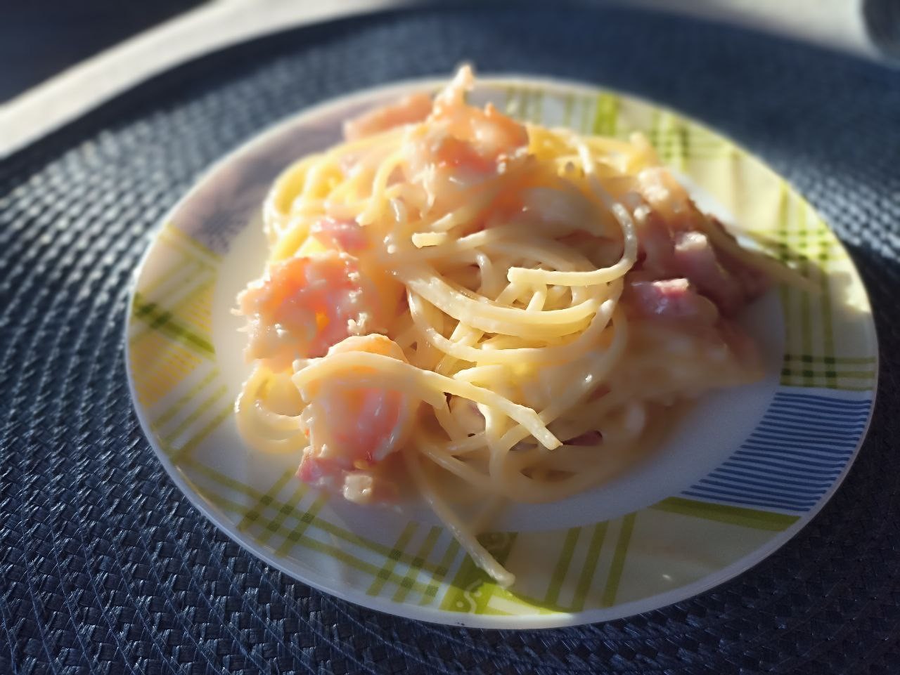 Никогда не пробовала пасту с морепродуктами. Увидела несложный рецепт пасты карбонара с креветками и решила попробовать. К сожалению, не было в наличии оливкового масла, поэтому готовила на обычном подсолнечным, было всё-равно вкусно