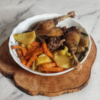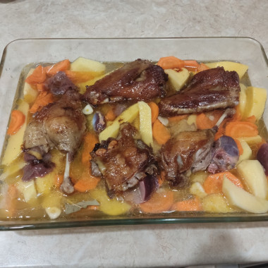Картофель очистила и нарезала дольками. Морковь нарезала полукольцами, чеснок нарезала пластинками. В форму для запекания выложила картофель, морковь, посолила, посыпала специями. Сверху выложила обжаренные части утки. Налила воды, закрыла фольгой и поставила запекаться в духовку при 200° на 50 минут. Затем сняла фольгу и ещё минут 15.