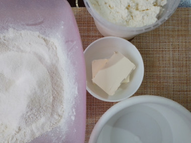 Пока тесто охлаждается, подготовьте необходимые ингредиенты для начинки. Творог лучше берите слегка влажный, не комковатый. Жирность особого значения не имеет. Идеально подходит творог в брикетах - он достаточно мягкий, в меру влажный, без мелких крупинок.