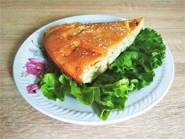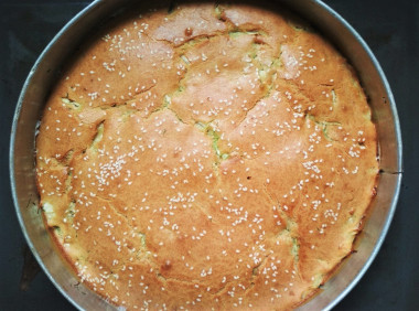 Разогрейте духовку до 180°С и отправьте в нее форму с пирогом. Запекайте пирог 40 минут, он должен стать золотистым сверху и сухим внутри. Готовому пирогу дайте немного постоять, потом подавайте его на стол. Приятного аппетита!