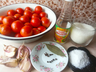 Выложите на дно стерилизованной 2-х литровой банки лавровый лист, пять горошин черного перца, четыре гвоздики и необходимое количество помидоров с чесноком. О том, как правильно стерилизовать банки и много других советов по консервации и читайте в конце рецепта.