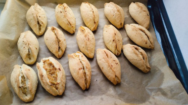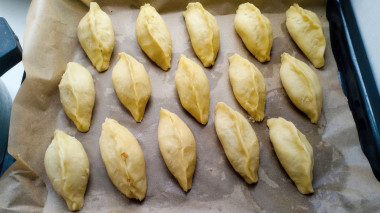 Получившиеся пирожки выложите на застеленный пергаментом и смазанный растительным маслом противень. При желании можете смазать пирожки взбитым яйцом. Я не смазывала, так как в тесте много сливочного масла. Выпекайте пирожки около 30 минут в разогретой до 180°С духовке. Время и температура указаны приблизительно, ориентируйтесь на особенности работы вашей техники. Подробнее о духовках читайте в статье по шагами.
