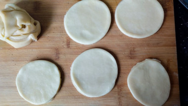 Раскатайте каждую часть на посыпанном мукой столе в тонкий круг и с помощью стакана вырежьте из теста кружочки.