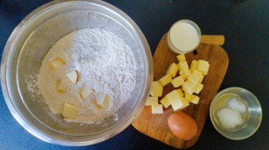 Перетрите муку с маслом руками в крошку. Для ускорения процесса можете взбить муку и масло в блендере. Муки может потребоваться немного меньше или больше, смотрите по консистенции теста. О свойствах муки читайте в отдельной статье в конце этого рецепта.