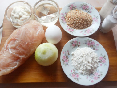Как сделать котлеты куриные рубленные с майонезом? Приготовьте все продукты по списку: куриное филе (возьмите охлажденное, котлеты из него будут сочнее), яйцо, лук, майонез (у меня 67% жирности), соль, масло с высокой температурой дымления для жарки, сухари.