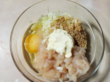 В глубокой миске соедините нарезанное куриное филе, лук, майонез, вбейте в массу яйцо и добавьте соль. Тщательно перемешайте.