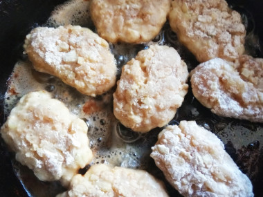 Разогрейте сковороду, добавьте в нее масло для жарки. Понять, что масло достаточно разогрелось, можно опустив в него лопатку. Если вокруг лопатки собираются пузырьки - пора приступать к обжариванию котлет. Выкладывайте на сковороду запанированные в муке котлеты (не очень тесно). Обжарьте с одной стороны до подрумянивания, примерно 3-4 минуты. Время указываю приблизительное, так как бытовая техника и сковороды у всех разные.