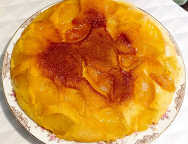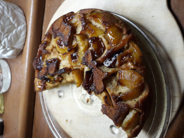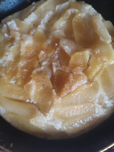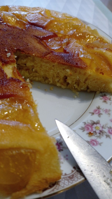 Очень мне понравилось готовить пирог - быстро и просто. Только яблоки подкачали - практически растворились в карамели, даже со шкуркой. Но это не повлияло на вкус - они пропитали всю верхнюю корочку. Пирог похож на шарлотку, но более ароматную за счет карамели и цедры. Манка придала пирогу рассыпчатость.