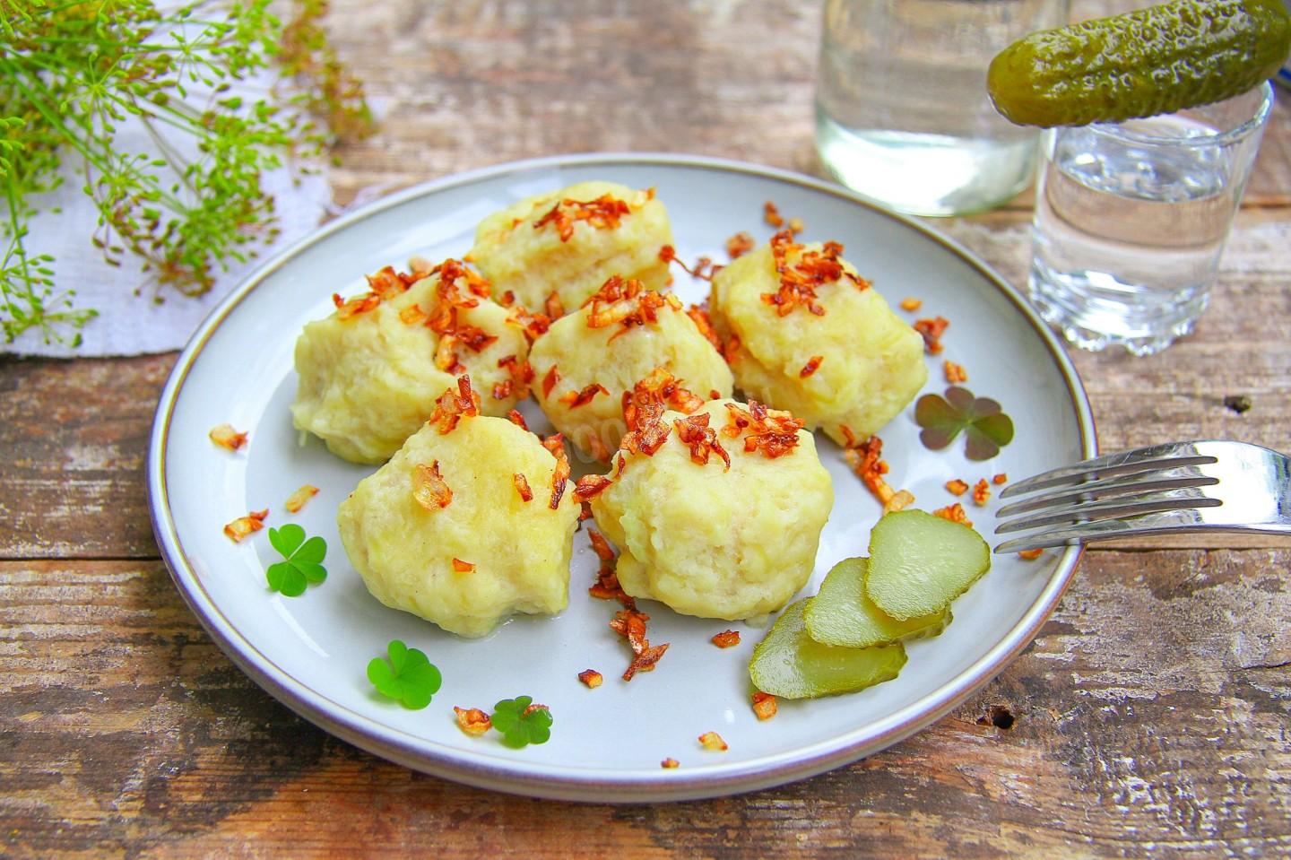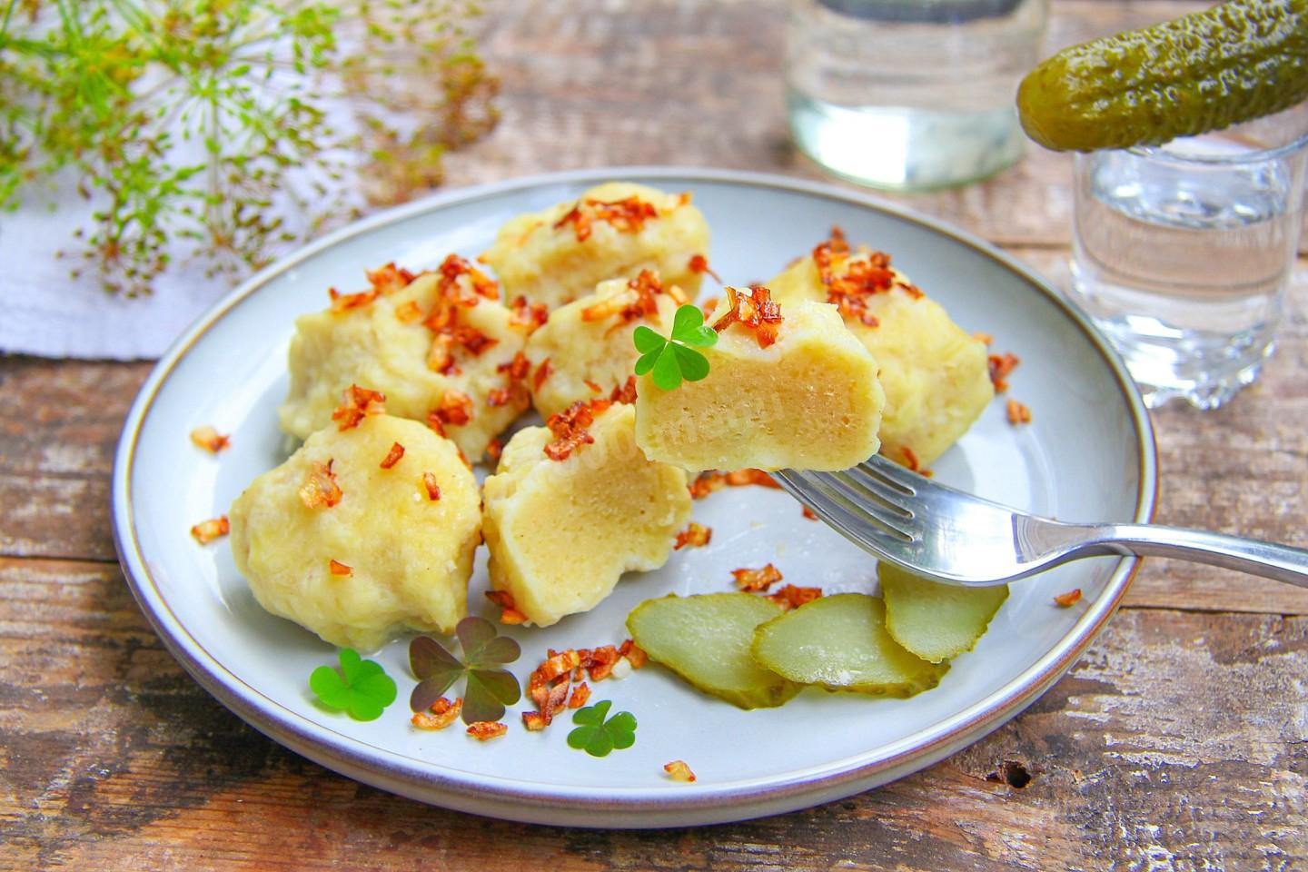 Клецки получаются плотными, чувствуется мускатный орех. В сочетании с жареным луком и соленым огурчиком они (разумеется, в обобщенном варианте) похожи на обычный отварной картофель.