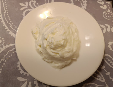 И кое как успела его сфотографировать для отчёта... Детям очень понравился творожок. Он похож на творожный крем или на хорошенько пробитый блендером творог, конечно для нашей большой семьи одной такой порции маловато... И обычный способ приготовления домашнего творога (прогревание кефира) более быстрый. Но такой способ - заморозкой кефира обязательно возьму на заметку, потому что получается готовый творожный крем.