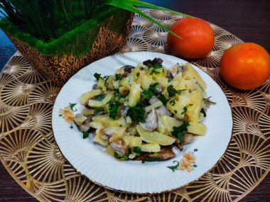 На сковороде разогрела масло,обжарила сначала лук, затем добавила грибы,перемешала. Далее добавила картофель и обжарила до готовности. Сметану раздавила немного водой,вылила в сковороду и ещё немного потопила. В конце добавила измельчённую зелень петрушки.