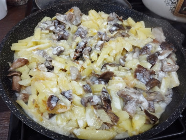 Картошка с грибами на сковороде со сметаной моё любимое блюдо. Оно и так аппетитное, а сметана придает неповторимый сливочный вкус. так и хочется добавки. Большое спасибо за рецепт!