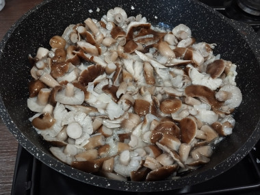 Затем выложите в сковороду грибы и перемешайте их с луком. Обжаривайте еще 2-3 минуты.