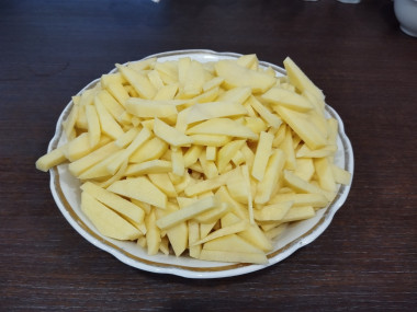 Очищенный картофель нарежьте соломкой или кружочками. Выложите картофель в сковороду. Продолжайте обжаривать еще минут 10. Крышку можно не накрывать, чтобы картофель не начал рассыпаться.