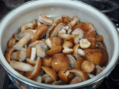 Набрали немного грибов опят и решила приготовить картошку с грибами на сковороде со сметаной. Грибы помыла и отварила в кипящей воде 20 минут. Остудила и крупные грибы порезала,а мелкие оставила целыми. Картофель очистила и порезала брусочками,лук мелко порезала.