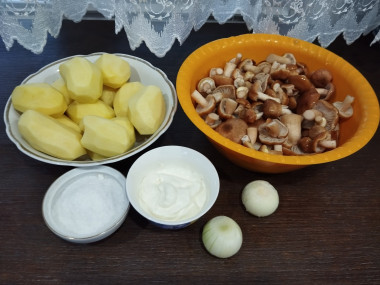 Калорийность продуктов: Картошка, Грибы, Лук, Сметана, Вода, Растительное масло, Соль, Специи сухие