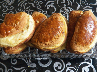Теперь начинка: белок взбиваем с сахаром, добавляем творог (предварительно протереть), сметану и муку. На каждый кусочек теста положите чайную ложку начинки, соединить половинки, смазать сочники яичным желтком и определить в духовку на 30-40 минут при большой температуре (220-230 градусов).