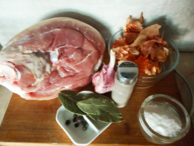 Как сделать свиную рульку вареная в луковой шелухе в домашних условиях? Подготовьте все необходимые ингредиенты. Луковой шелухи будет достаточно пары горстей. Это, примерно, 10-12 очищенных крупных луковиц. Зубчики чеснока у меня очень крупные. Если брать маленькие, то возьмите их больше по количеству.