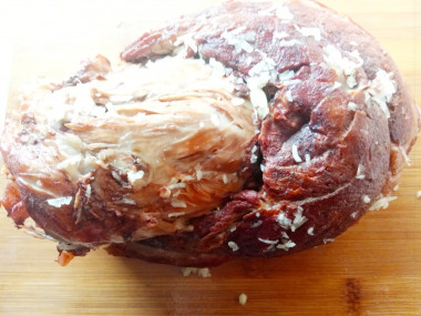 Готовую рульку остудите в воде (хотя бы просто до теплого состояния). Это необходимо для того, чтобы мясо окрасилось наиболее в темный цвет. Затем извлеките и пропитайте бумажными полотенцами лишнюю влагу с поверхности мяса. Очищенный чеснок пропустите через чеснокодавилку и обмажьте со всех сторон измельченным чесноком. Оберните в пищевую пленку и уберите в холодильник на 3-4 часа. Мясо с чесноком становится очень ароматное.
