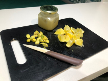Измельчите имбирь с лимоном в однородную массу. Если у вас нет измельчителя можно все пропустить через мясорубку.