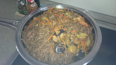 Готовую лапшу слейте в дуршлаг и затем закиньте в сковороду к овощам. Я переложила сразу из кастрюли в сковородку при помощи специальной лопатки для спагетти.