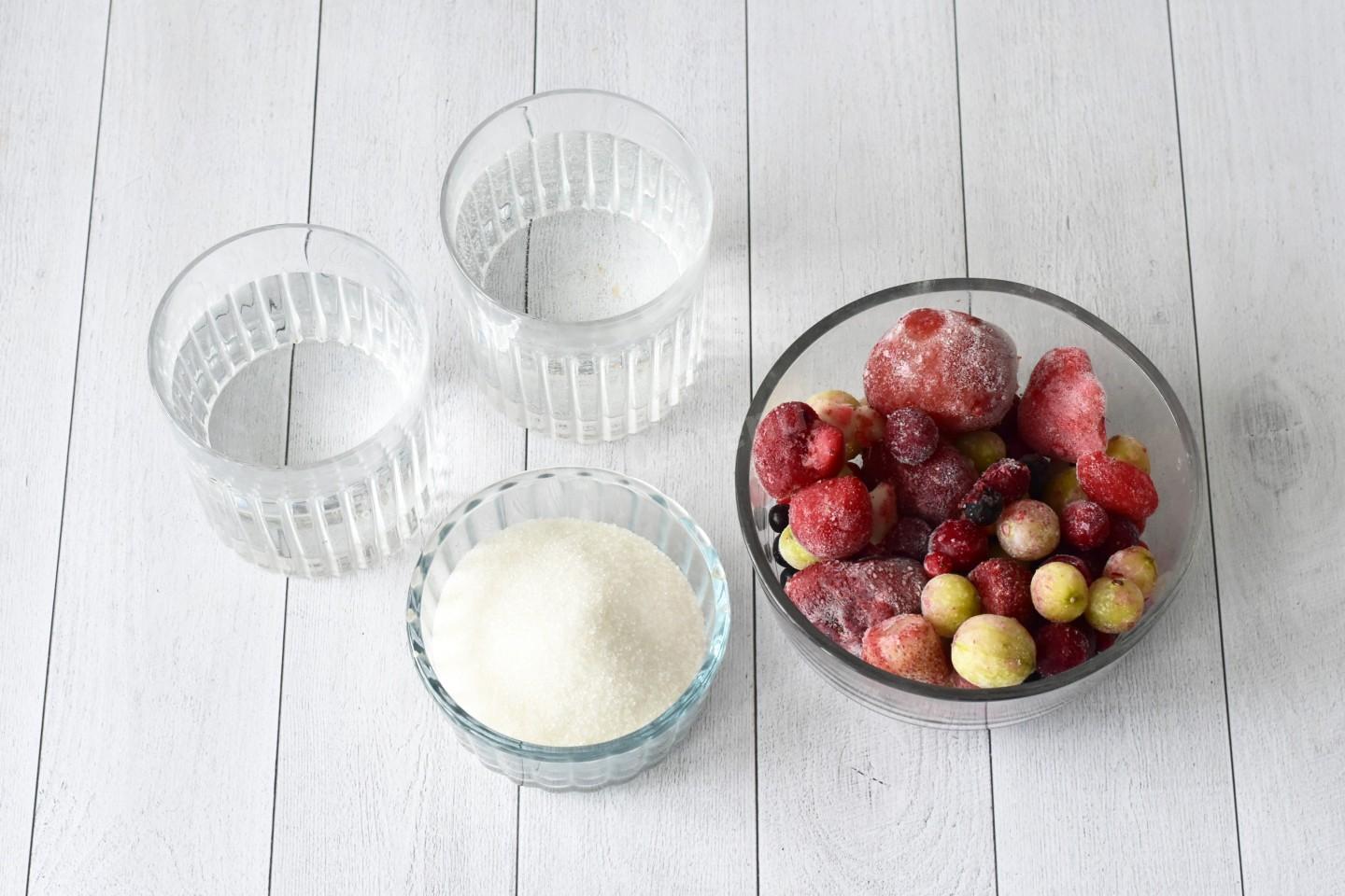 Подготовьте ингредиенты. Ягоды подойдут как свежие, так и замороженные. У меня готовая смесь ягод из вишни, черной и красной смородины, винограда и клубники. По желанию можете делать спотыкач из одного вида ягод. Водку берите проверенную. От качества алкоголя зависит итоговый вкус вашего спотыкача.
