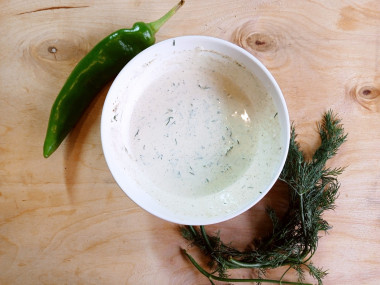 Зелень помойте, обсушите, мелко нарежьте и добавьте в соус. Если вдруг у вас нет свежей зелени, ее можно заменить сушеной.