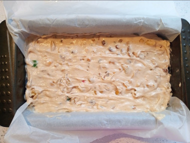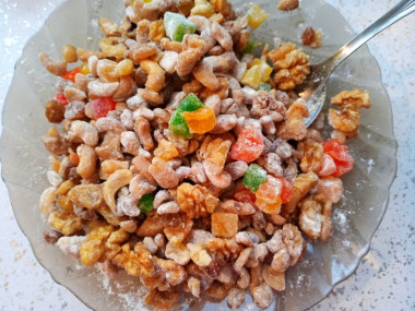 2 ст.л. муки смешайте с сухофруктами. Считается, что так орехи не осядут на дно при выпекании.
