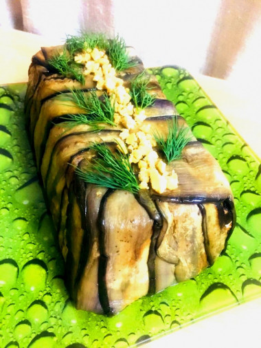 Приготовленный торт из баклажанов украшаем сверху веточкой базилика и листиками петрушки.