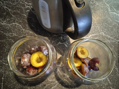 Как сварить компот из сливы на литровую банку без стерилизации на зиму? Подготовьте необходимые ингредиенты. Сливы можете использовать любых сортов, но учтите, что от сорта слив напрямую зависит и вкус, и цвет компота. Если используете желтые сливы, то компот будет светло-желтого оттенка и сладкий, с красными сливами - алого цвета и слегка кисленький. А с синими сливами цвет компота будет бурым и сладковатый на вкус.