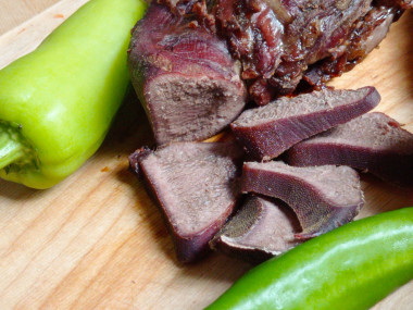 Отзыв 2: Рецепт очень простой. Не знаю, что именно мне понравилось в этой фотографии, но слюнки потекли (наверное, все-таки говяжий язык в разрезе). Сам рецепт интересен именно тем, что язык запекается в духовке (я всегда только варила).
