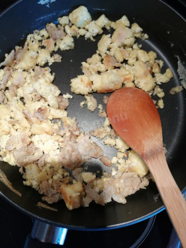 Влейте в сковороду яичную смесь и быстро перемешайте.