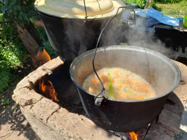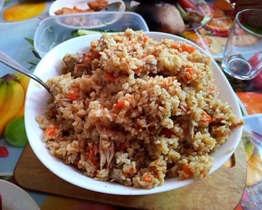В выходные приехали родственники в гости и мы решили приготовить обед на костре. Одним из блюд стал плов из говядины в казане на костре. Честно говоря, мы плов таким способом ещё не готовили, переживали, получится ли) Порции продуктов я уменьшила на одну треть. Готовкой занимался муж, а я направляла) У нас была молодая телятина, тушилась она примерно 40 минут. Для плова морковь нарезали крупно, чтобы она не развалилась от сильного нагрева. Лука тоже взяли побольше для сочности. У нас не оказалось зрелого чеснока, поэтому использовали свежий чеснок с грядки вместе с частью стебля. Этот чеснок очень ароматный и не сильно острый. Готовить оказалось не так уж и сложно, как мы думали. Только очень жарко от костра) После закладки риса (сорт для плова) плов готовился минут 20. За это время часть жидкости впиталась в рис, а часть выпарилась. Получилось просто великолепно! Плов необыкновенно вкусный, рис рассыпчатый, буквально каждое зёрнышко пропитано мясным соком со специями. Кстати из специй я от себя добавила смесь перцев и барбарис. Правда барбарис разварился, но вкус свой отдал) А ещё плов получился сладким. Наверное от большого количества моркови и лука. Такого вкусного плова мы ещё не пробовали. Теперь будем почаще готовить таким способом.