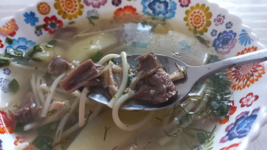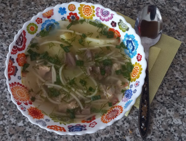 Для бульона взяла утиный окорок и ещё решила добавить кусок домашней курицы. Картофель порезала четвертинками. К сожалению, не добавила морковь, закончилась. Суп из утки с лапшой подавала с укропом и зелёным луком. Вся семья, попросила ещё добавку.