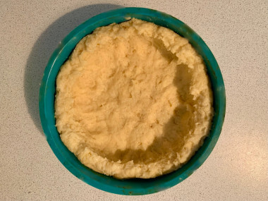 После этого раскатайте тесто в пласт. Пласт теста осторожно переложите в форму, сформируйте бортики. Форму лучше берите с антипригарным покрытием, диаметром 26 сантиметров. Поставьте форму с тестом в холодильник.